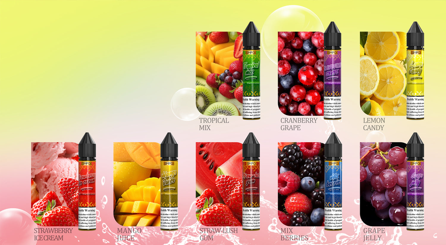 Mix berries,Straw-lush gum,Grape jelly,Mango juice ,Strawberry ice cream,Lemon candy,Cranberry grape,Tropical mix